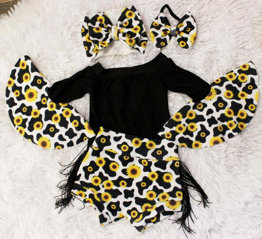 Helena Cow Spots and Sunflowers Bell Sleeve Leotard and High Waisted Fringed Bummie Outfit