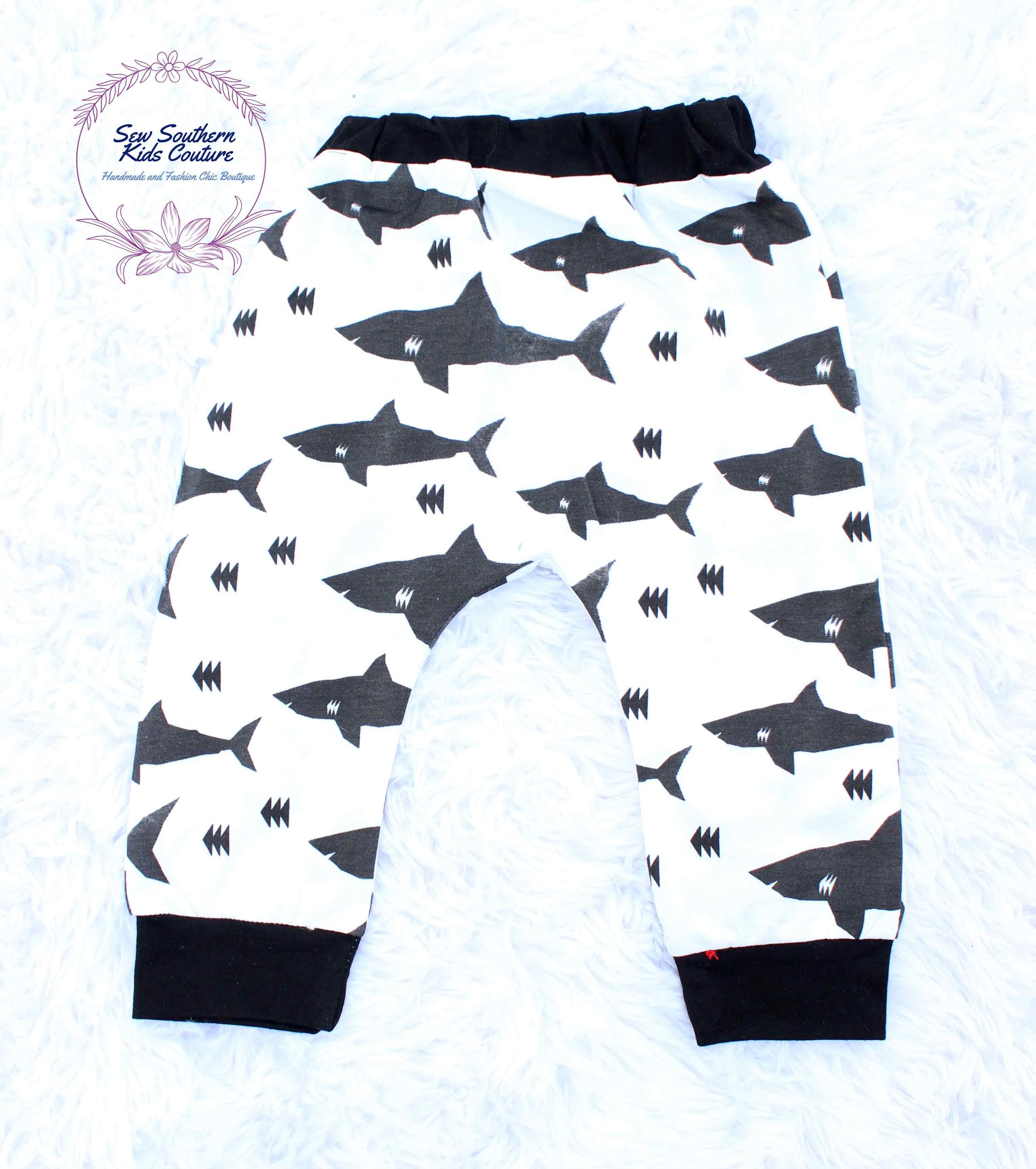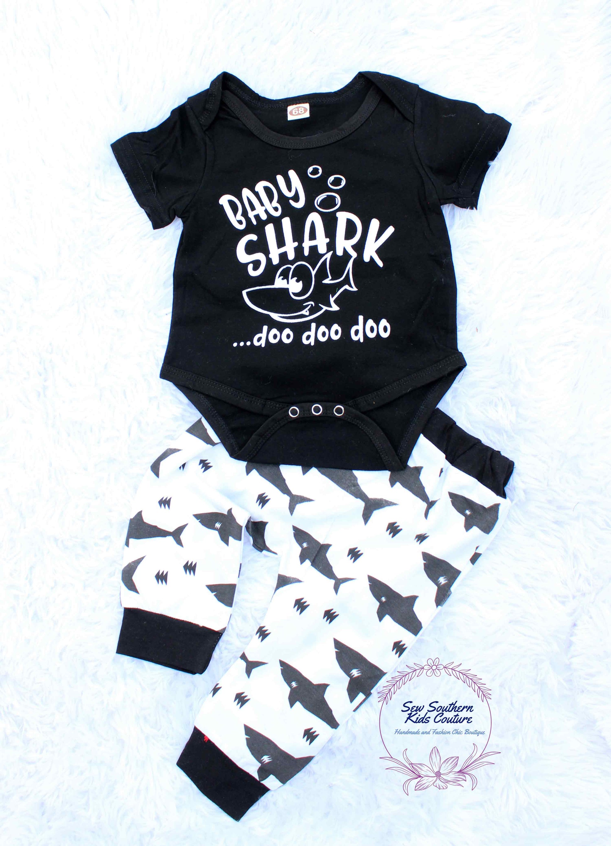 Adorable 2-pc Baby Shark Jogging Set. Includes black baby shark onesie with matching jogger style pants.