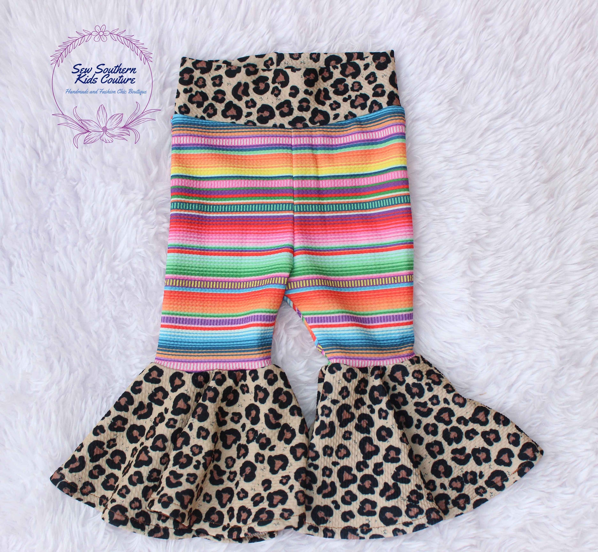 We love how vibrant these colors are! This rainbow Serape and Leopard print is just beautiful!! Your little one will be ready for any occasion in these adorable ultra-flare bell-bottoms! Perfect for little siblings, birthday parties, family gatherings or just because!