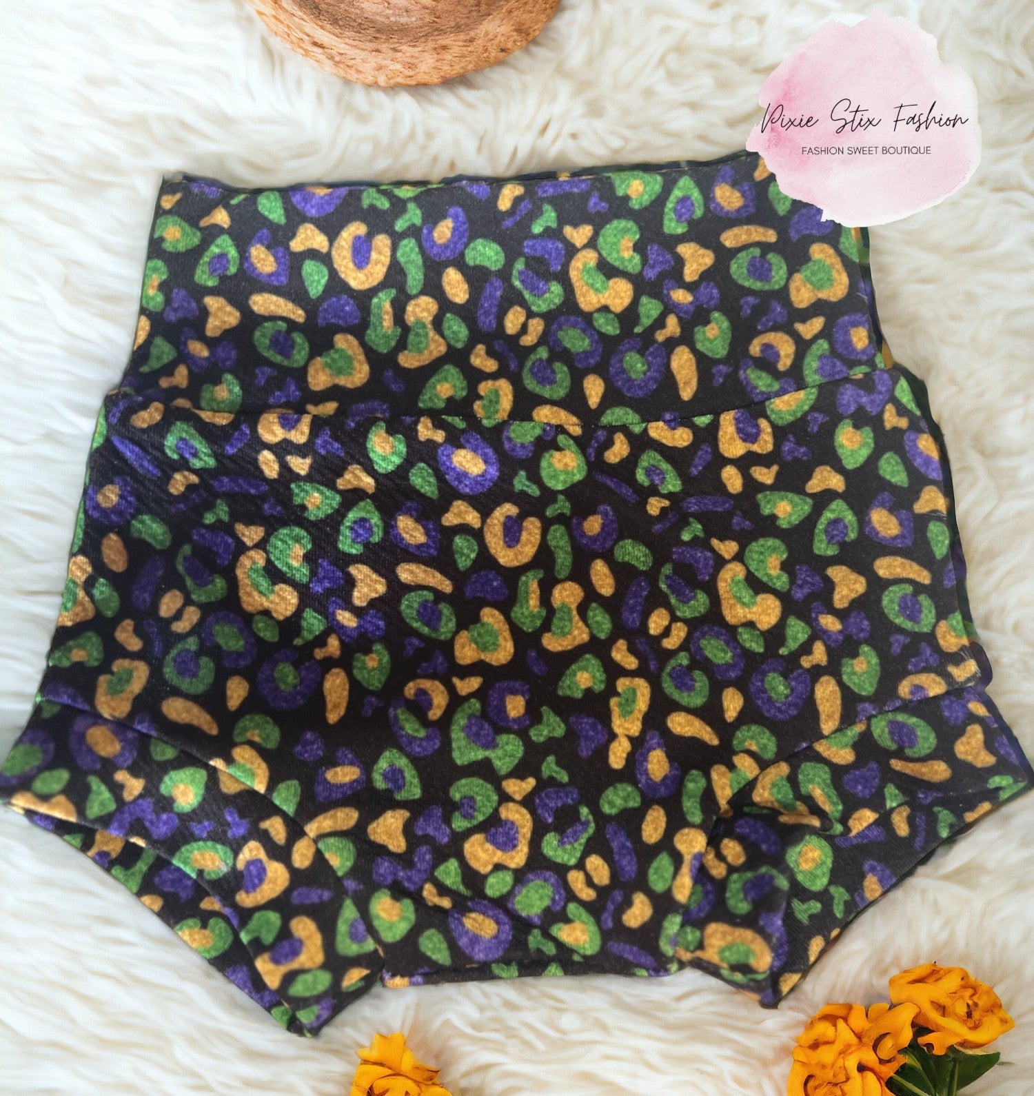 Baby Girl Mardi Gras Baby Bummie and Bow Set, High Waisted Toddler Shorts, Mardi Gras Cheetah/Leopard Bummies/Diaper Cover, Louisiana Baby