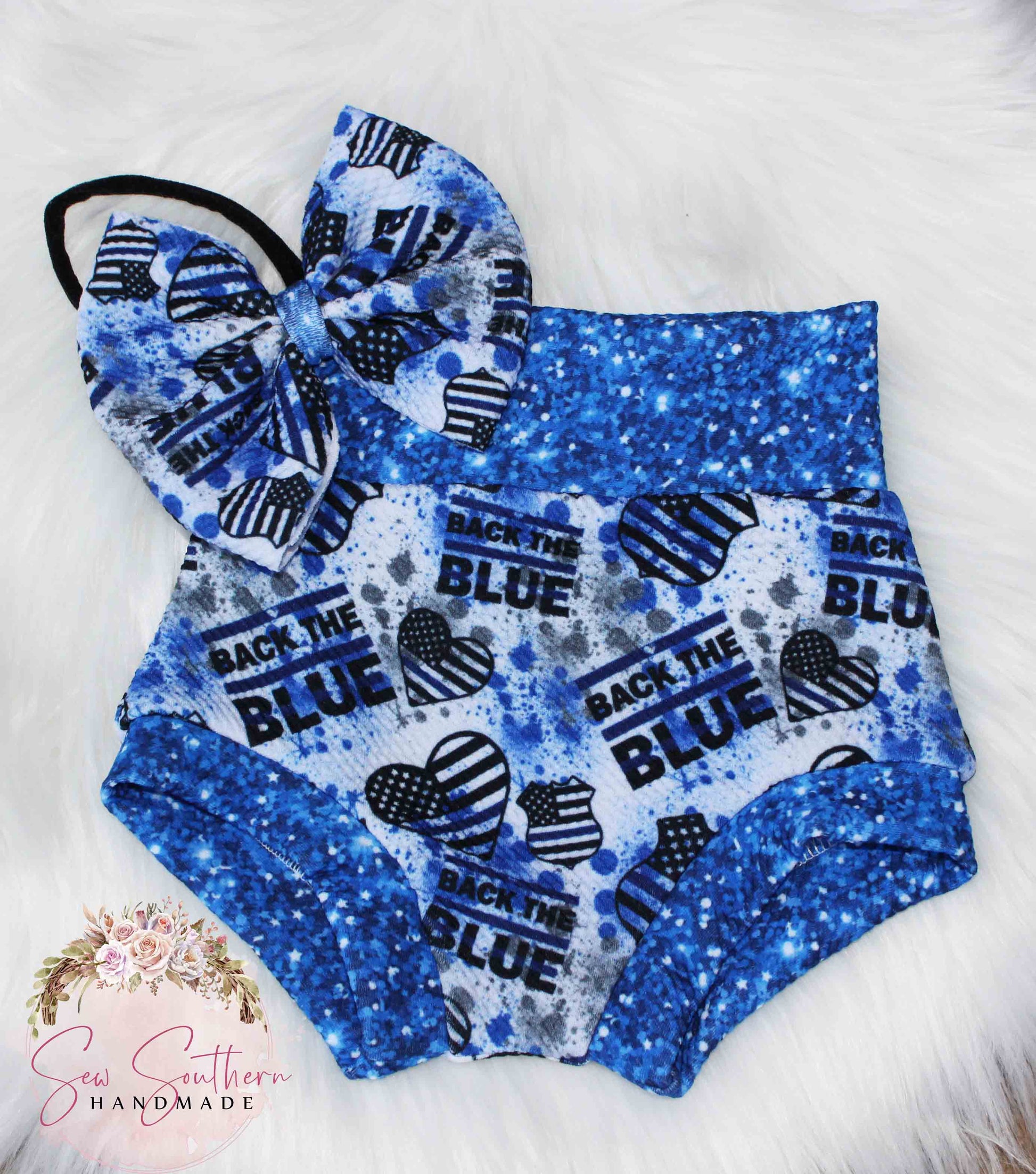 Back The BLUE Bummie, Baby Shorts, Thin Blue Line, High Waisted Bummie Shorts