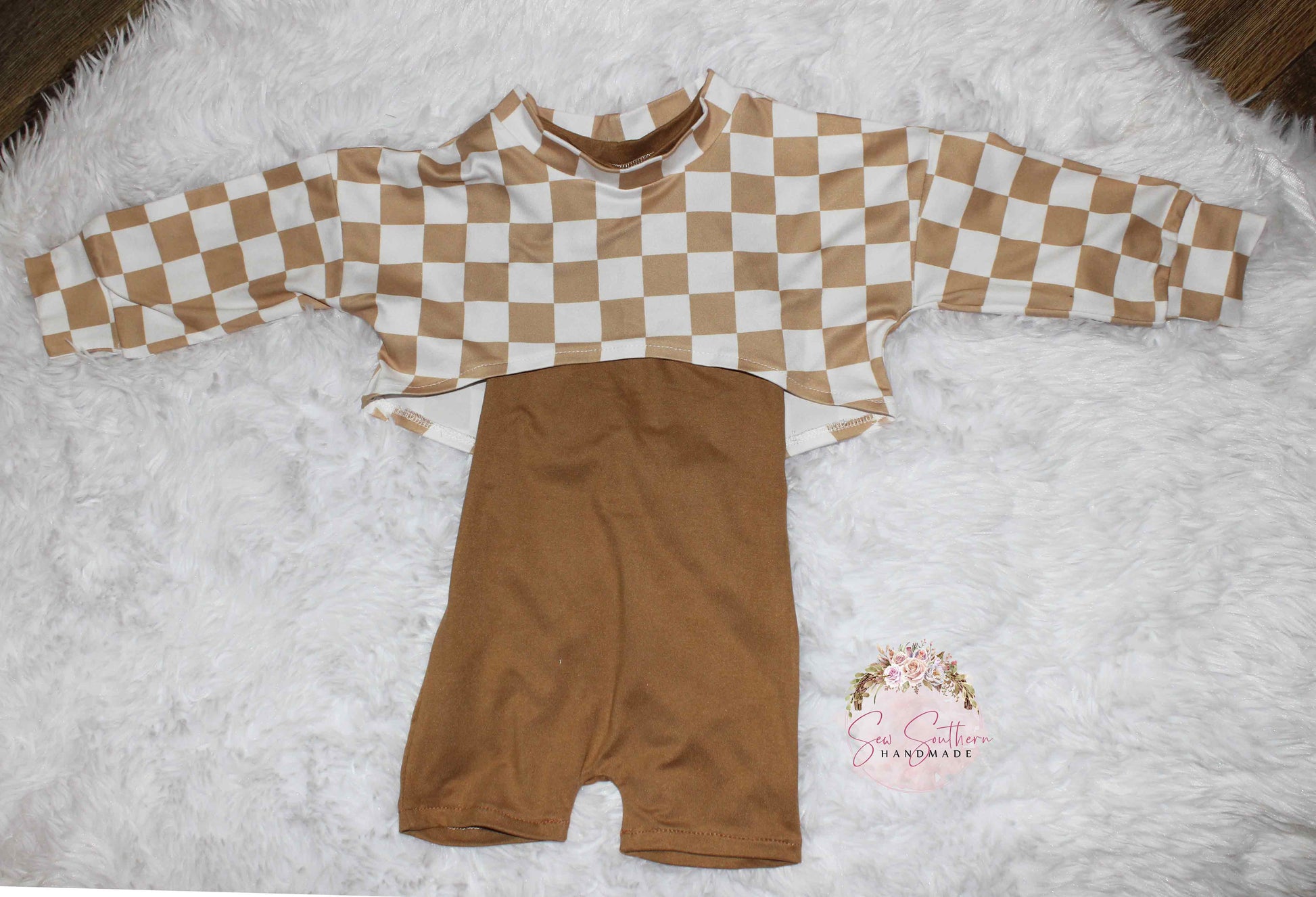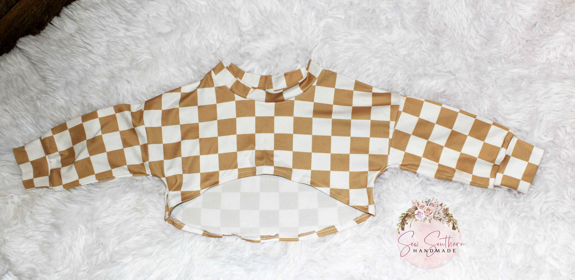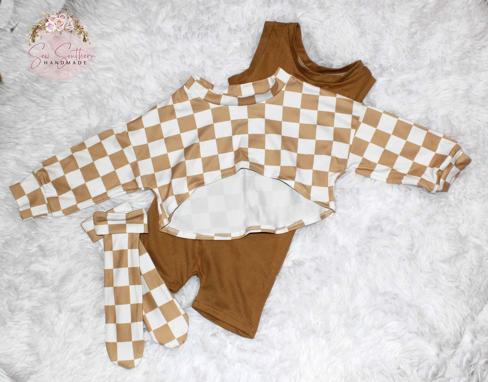 Adorable and so comfy, tan jumper with tan checkered crop top and matching knee socks. This set can be purchased all together, or each piece individually. 3-pc set includes: Tan Romper, Checkered Crop and Checkered Socks.