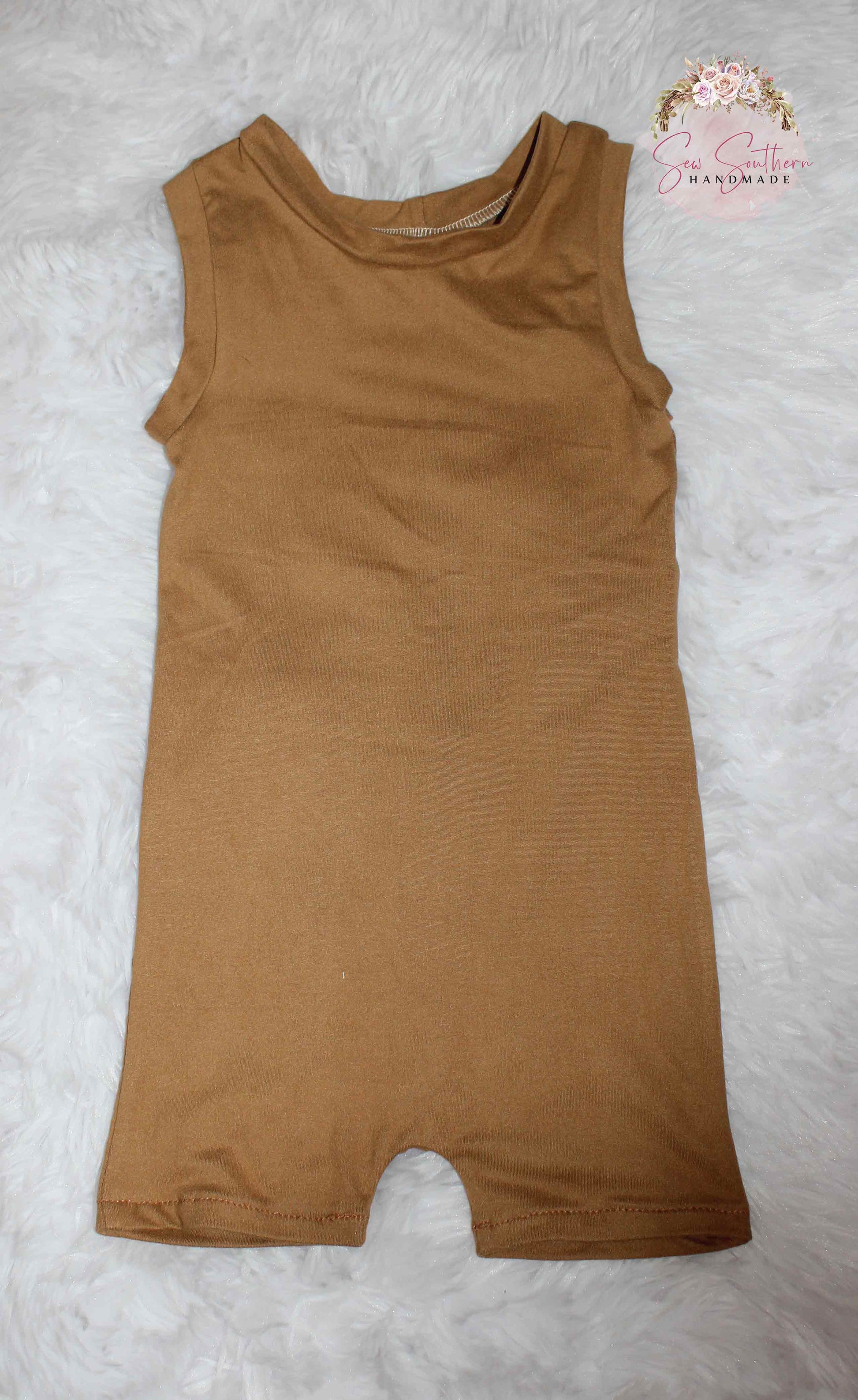 The tan sleeveless romper is soft and stretchy, crafted from double-brushed polyester knit. It is designed to slip on from the neck opening. There are no snaps on the jumper.