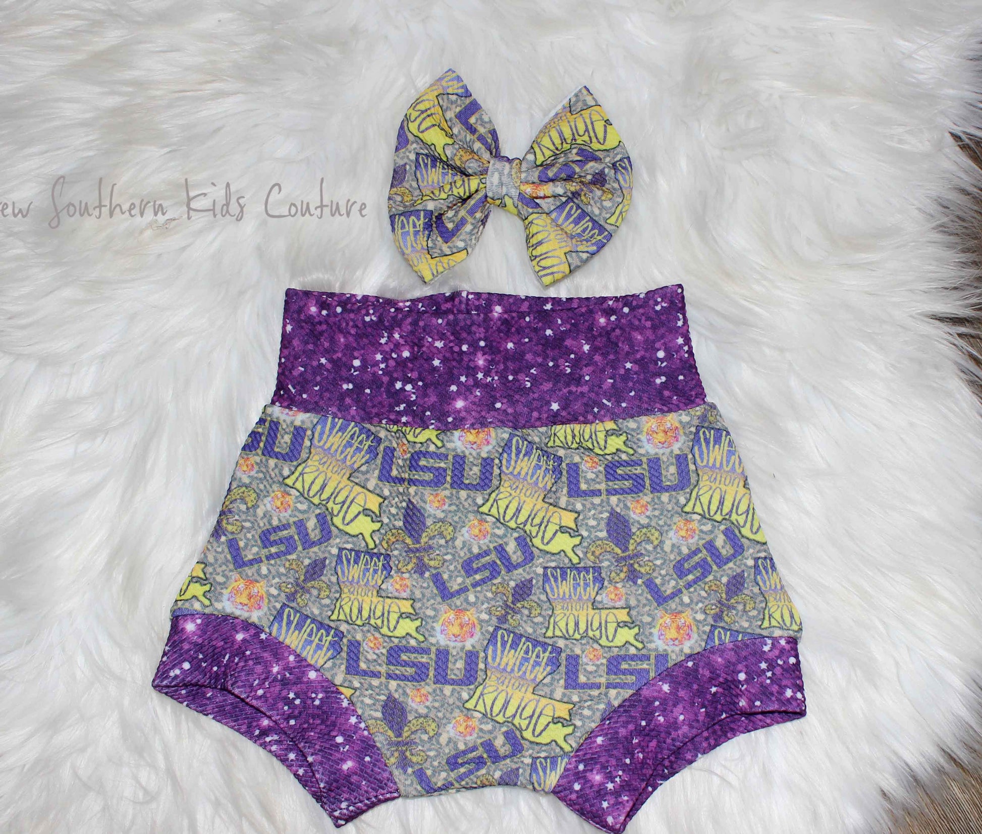 These adorable "LSU -Baton Rouge Tigers", Bummies and Bow Set is seriously SO CUTE! They would make the PERFECT gift for the LSU Tiger's Fan, Team photo shoots, or for everyday wear.