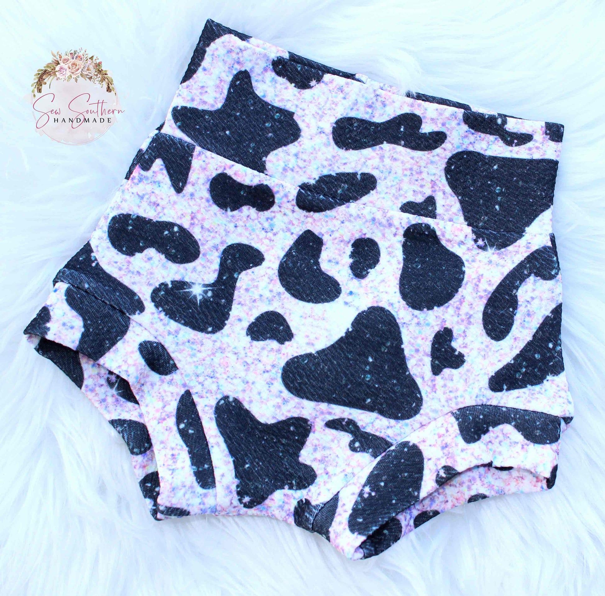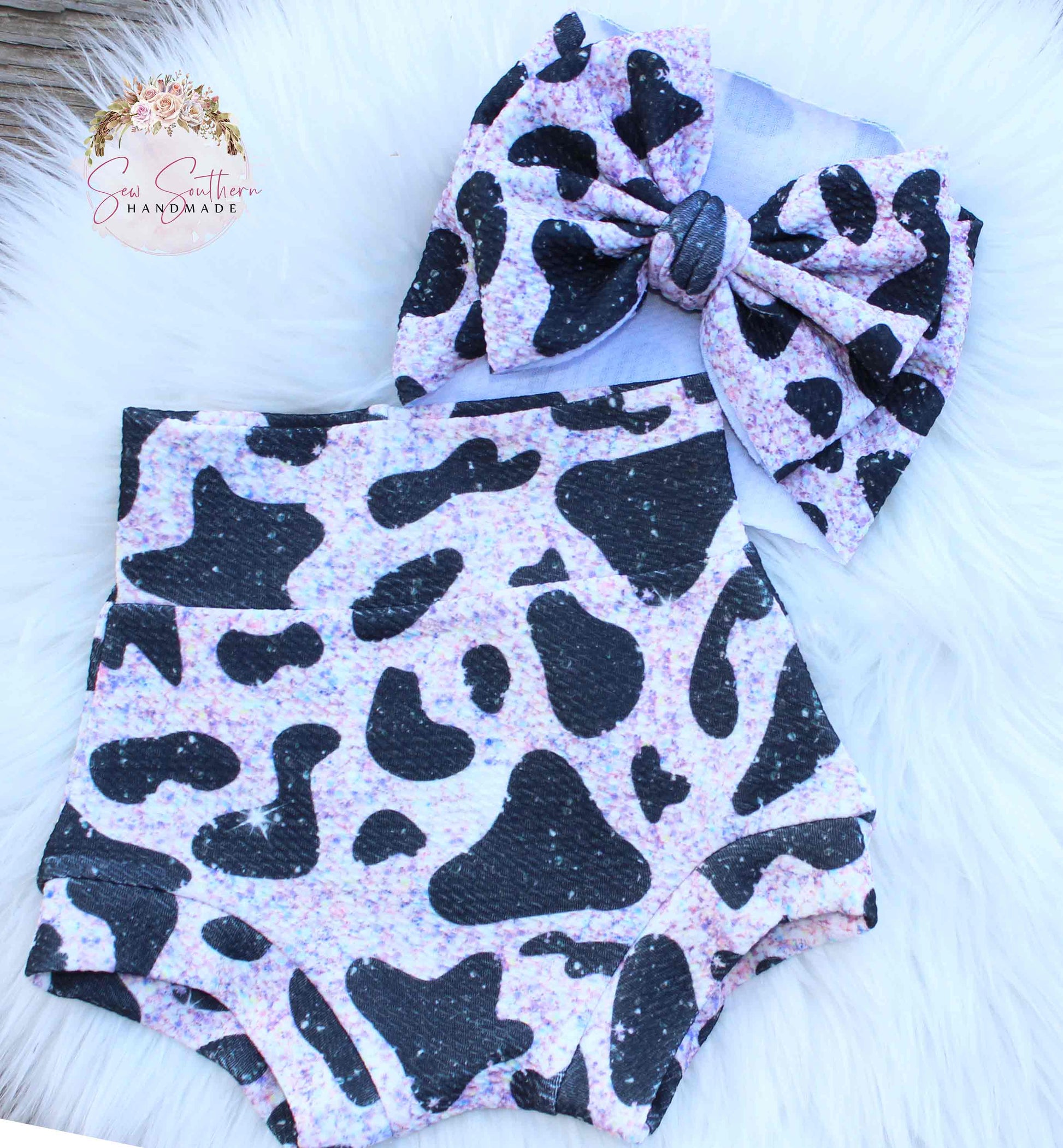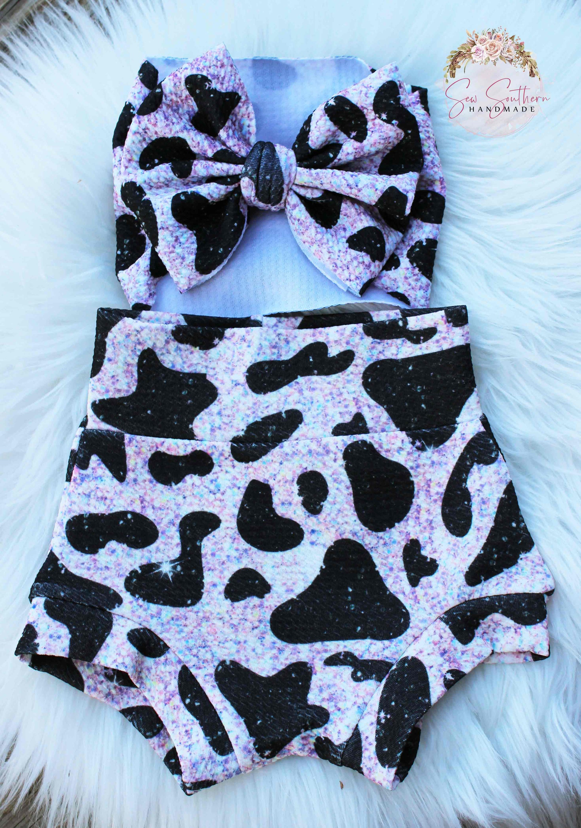 Faux Sparkle Cow Spots Highwaisted Bummies and Bow Set