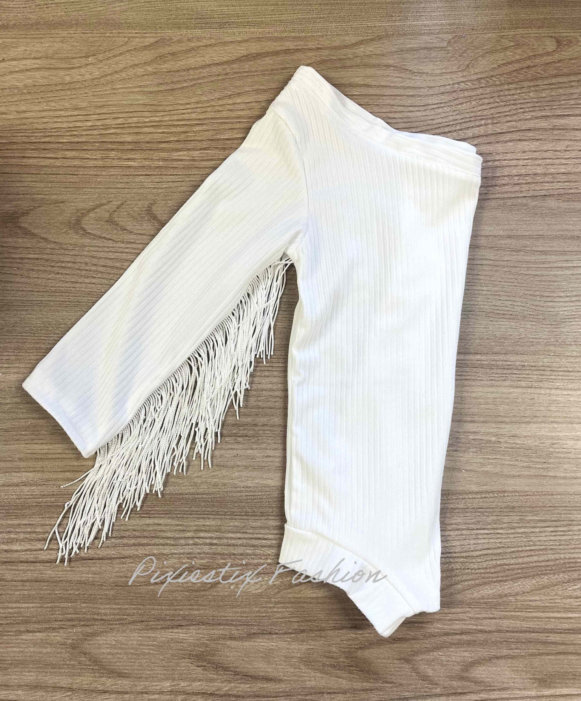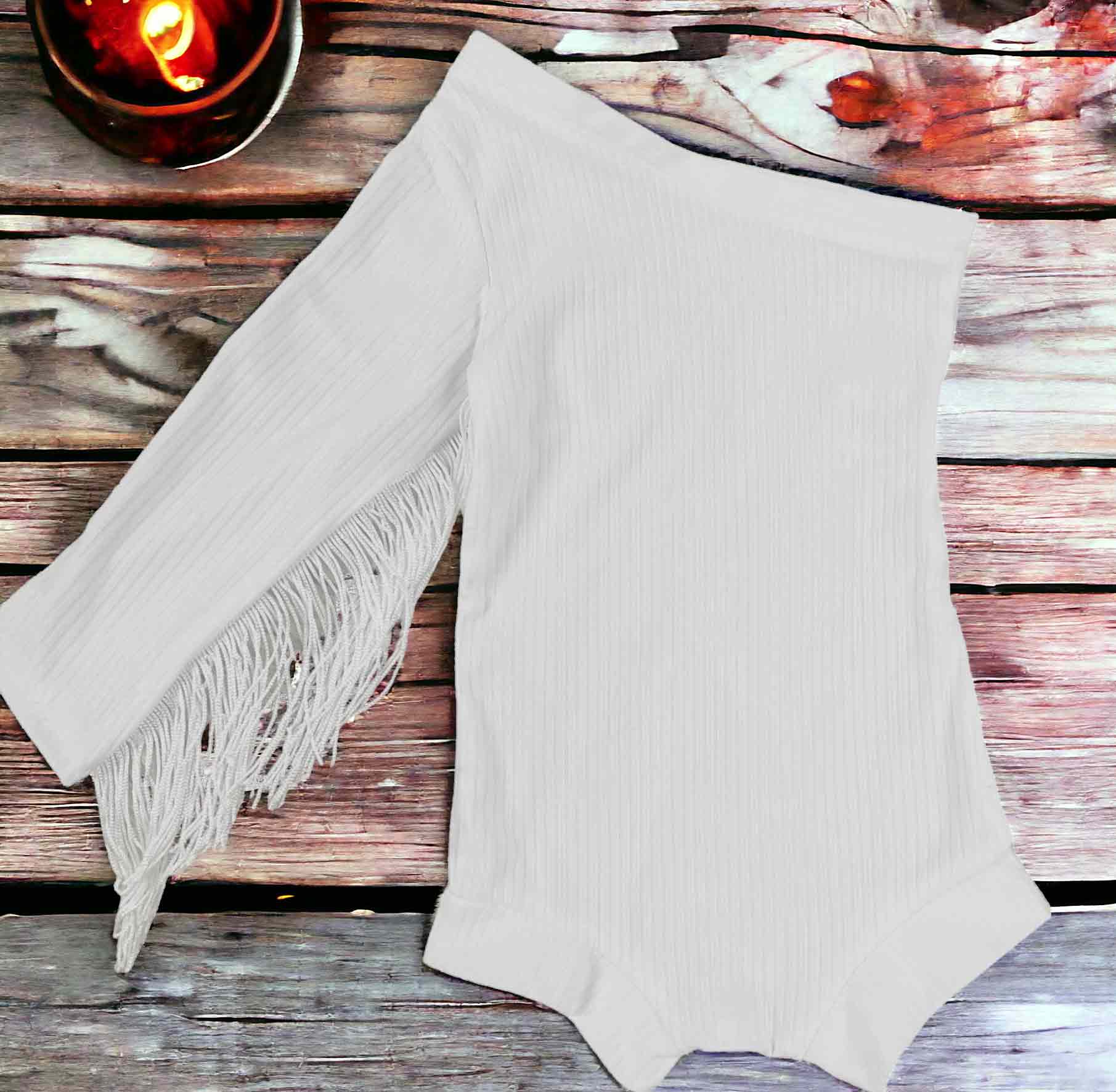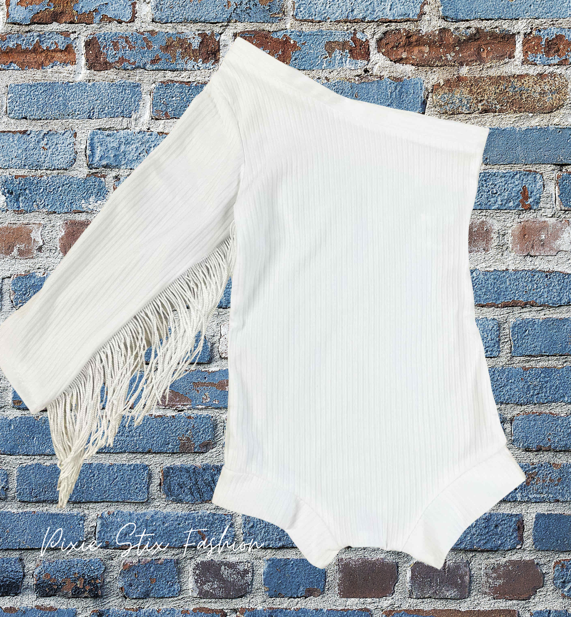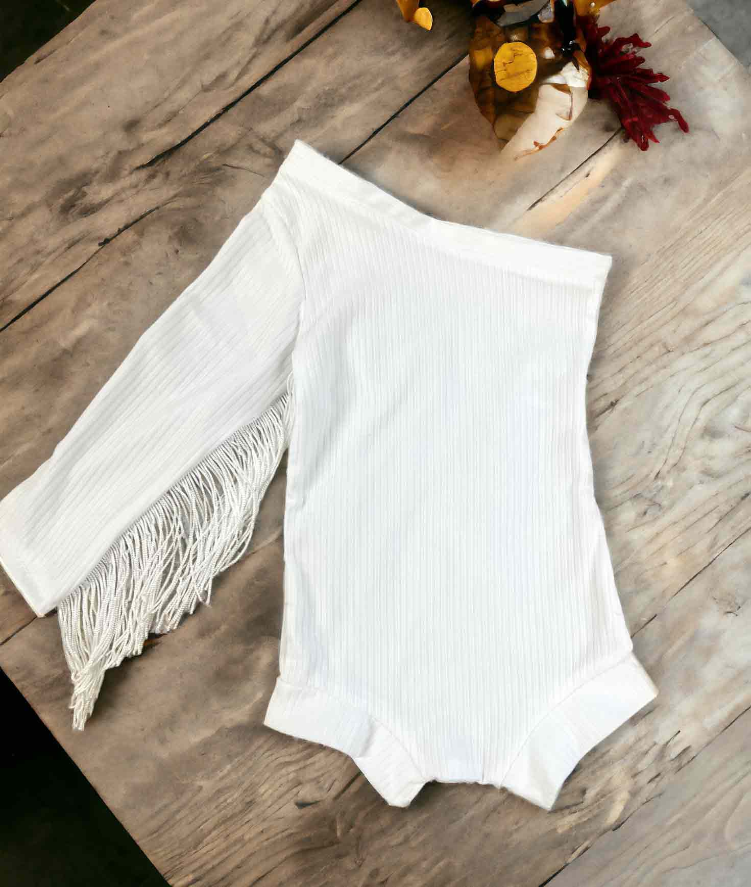 White One Shoulder Fringed Leotard/Baby Girl Leotard/One Shoulder Leotard/Girl's Western Leotard/Western Shirt/Cowgirl Fringe Sleeve Leotard