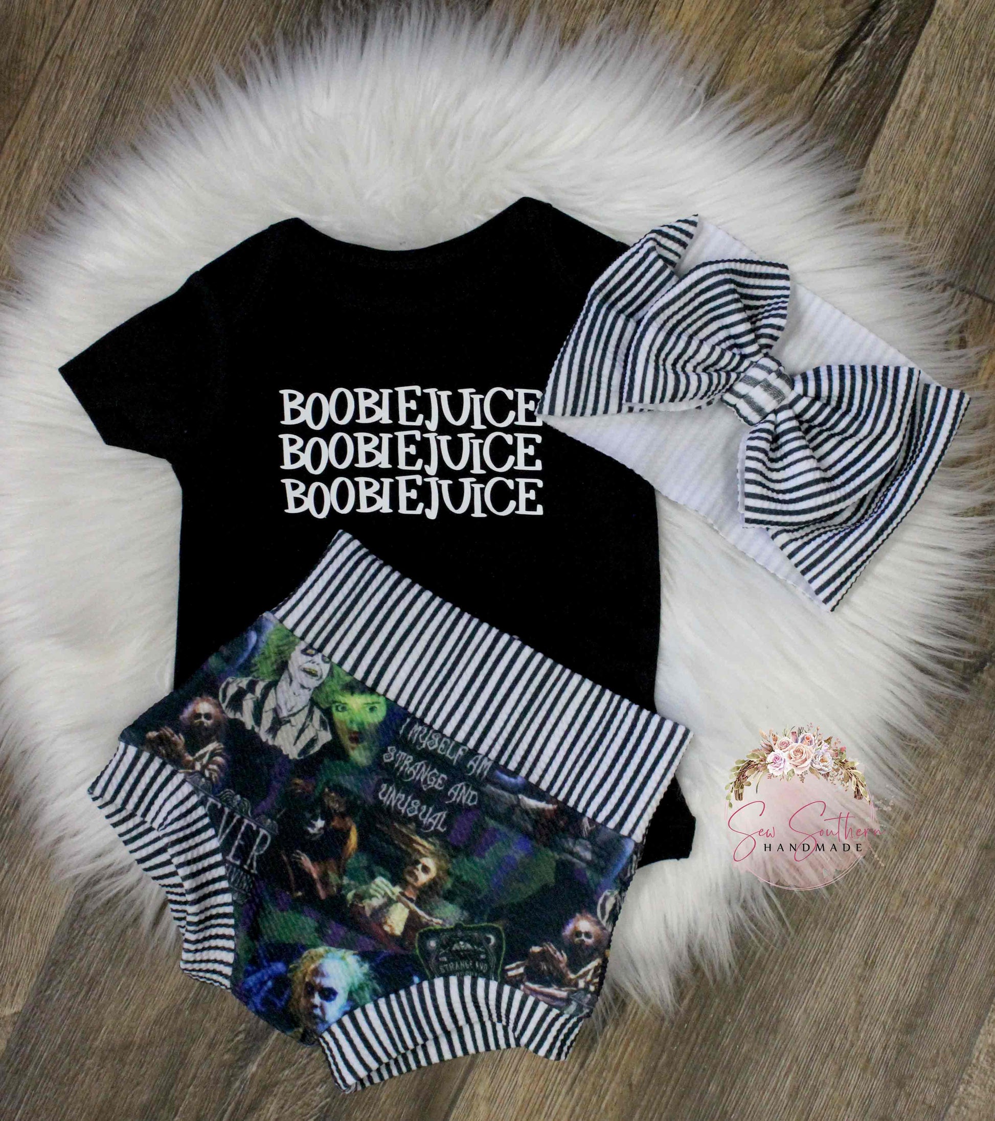 This adorable little Halloween Outfit is to die for!! The "Boobiejuice Boobiejuice Boobiejuice", is perfect for your breast- feeders! Without the bow, they are the perfect gender neutral or boy/girl twin outfits!