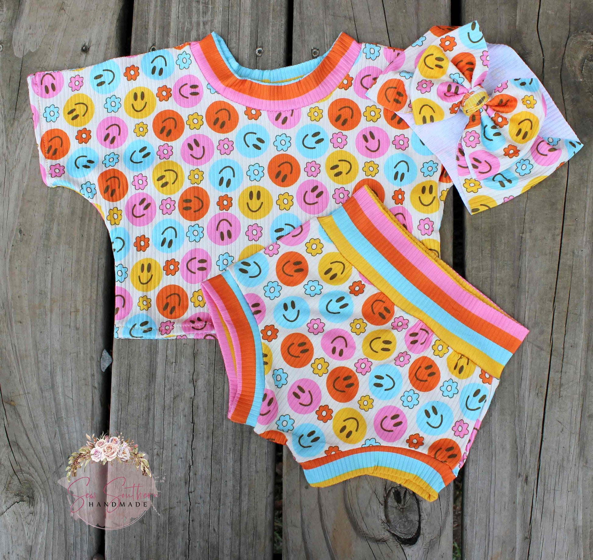 This set features a smiley print crop top with color block neckline, a matching smiley face bummies with color block waistband and cuffs, and choice of a matching bow headwrap. Its a super relaxed fit, and great for every occasion!