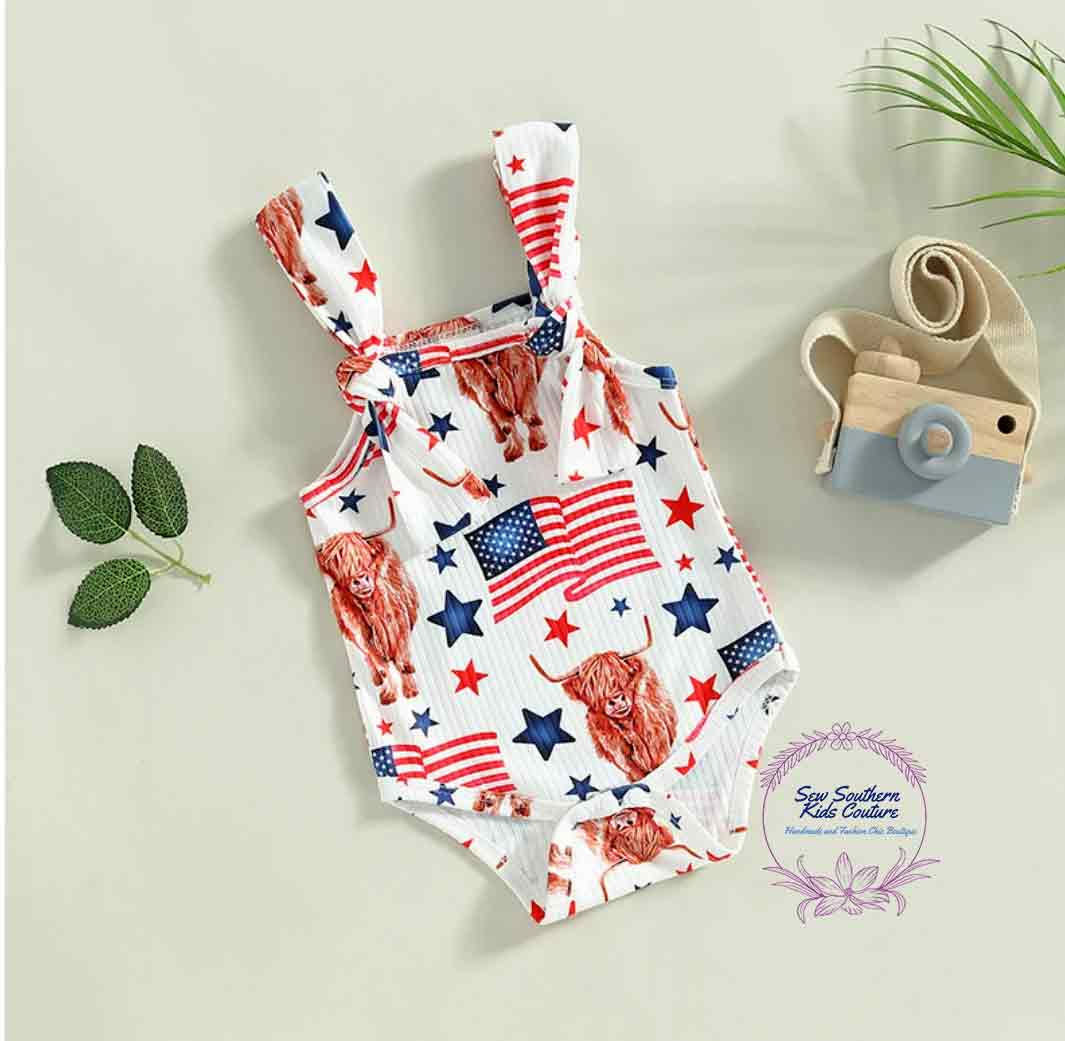 Our patriotic, ‘Highland Cow Fourth of July" romper is perfect for the Fourth of July or Memorial Day shenanigans! Made of cotton/poly blend fabric, your little one will be 100% cool and comfortable while being trendy and fashionable. This is a one piece romper with a snapable crotch for easy diaper changing.
