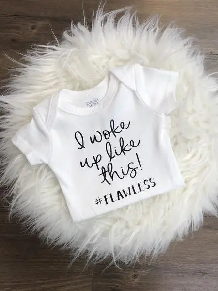 I woke up like this flawless infant bodysuit. Perfect for your beautiful little girl who wakes up flawless every morning! Great for gifting, newborn photos, or to use as a take home outfit.