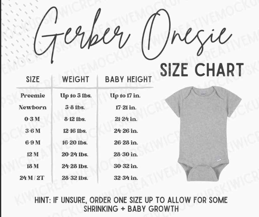 Genuine Gerber® Onesies® brand bodysuits are available in sizes Newborn to 12 months (short sleeve only). If you would like a Gerber® Onesies® brand bodysuit, please choose this option from the drop down size menu on listing. This brand runs small, we recommend to size up.