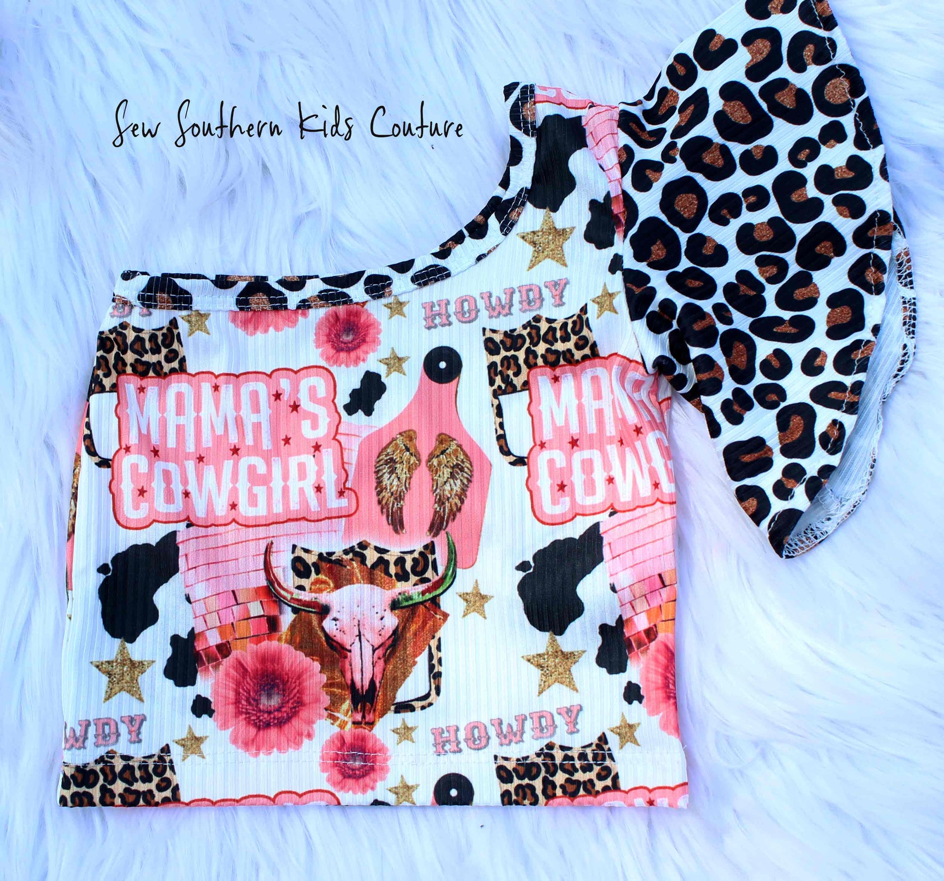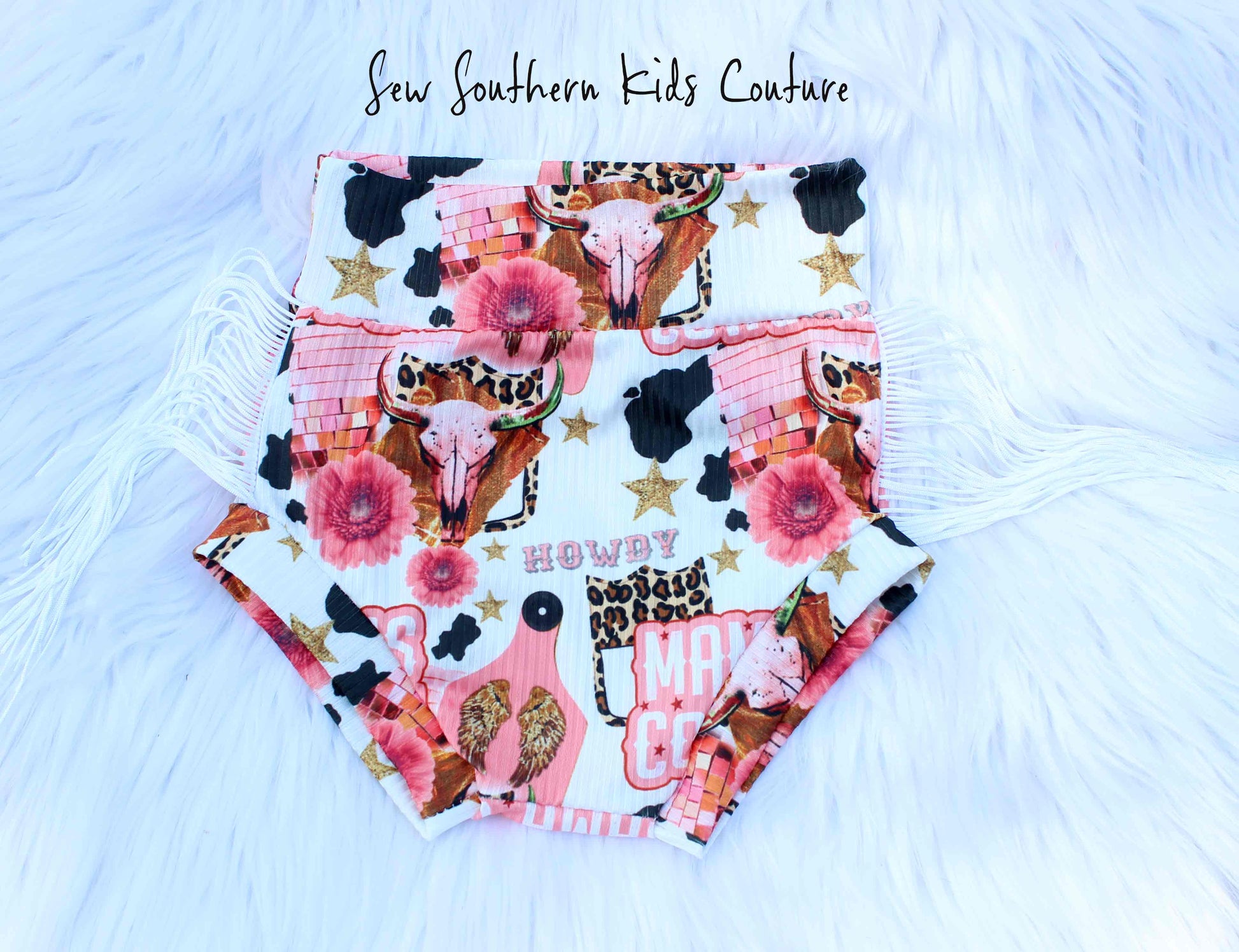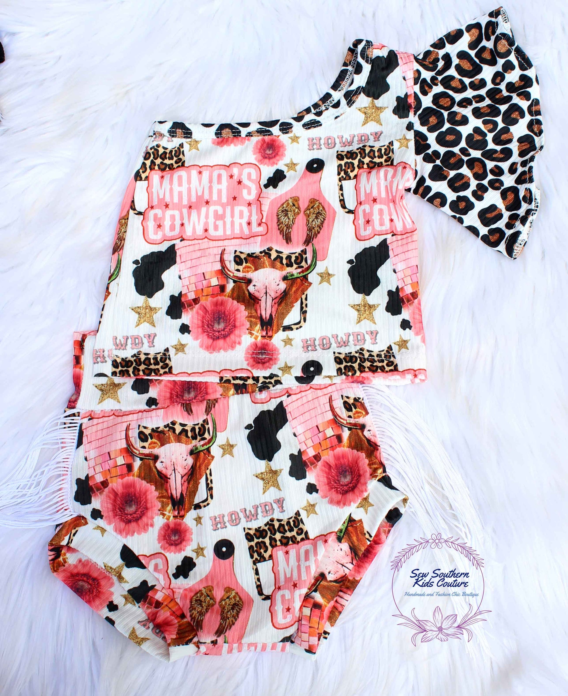 This super adorable Mama's Cowgirl, one shoulder cheetah and wester print flutter sleeve tank and fringe bummies set is so cute for your little cowgirl! You can purchase the 3-piece set which includes, Mama's Girl shoulder tank, bummies and black bow headwrap. Punchy halter top, cow print bummies and matching bow headwrap, (shown), bow on nylon band or bow on alligator clip. If you prefer only certain pieces, make your selection t checkout.