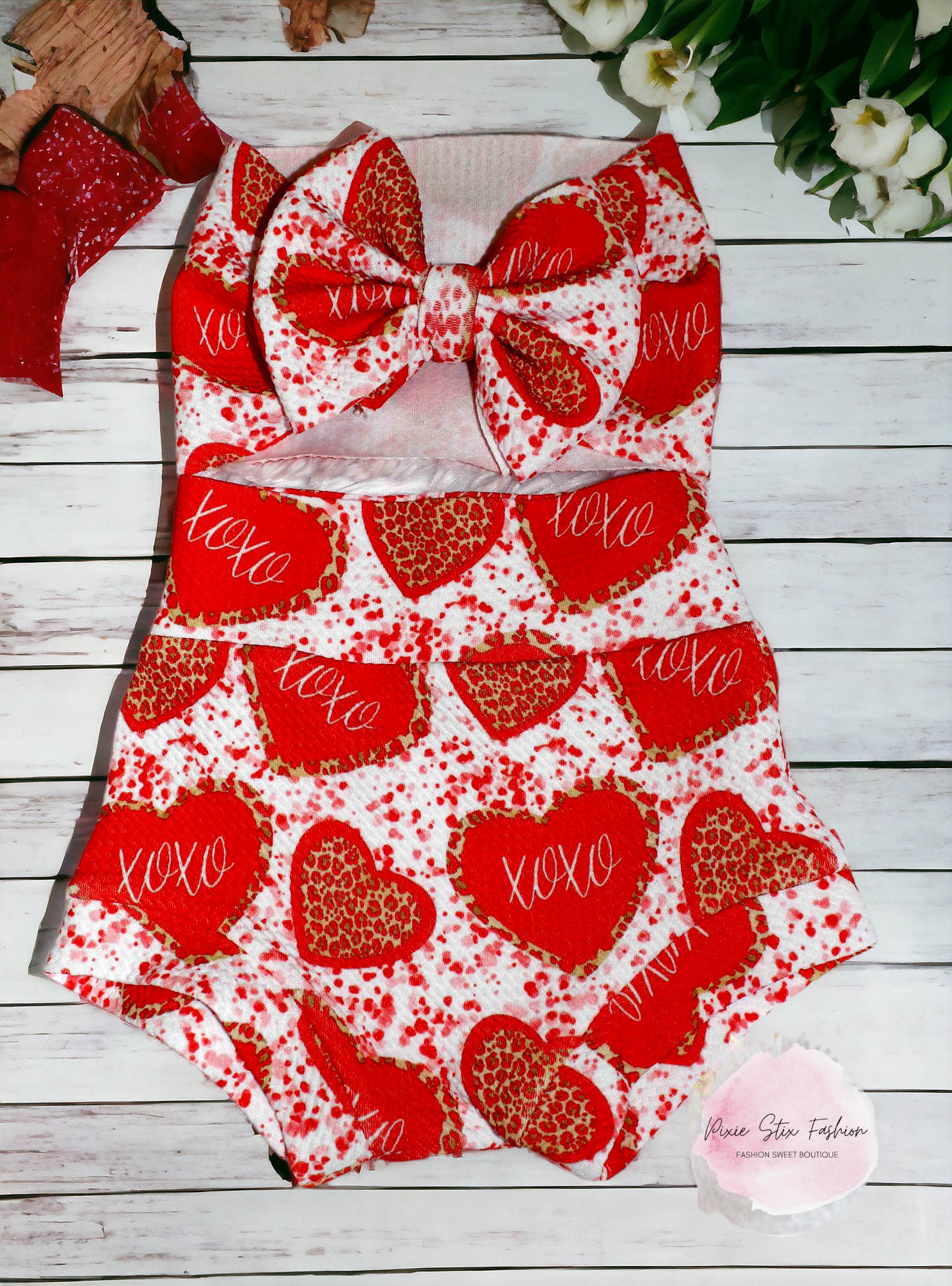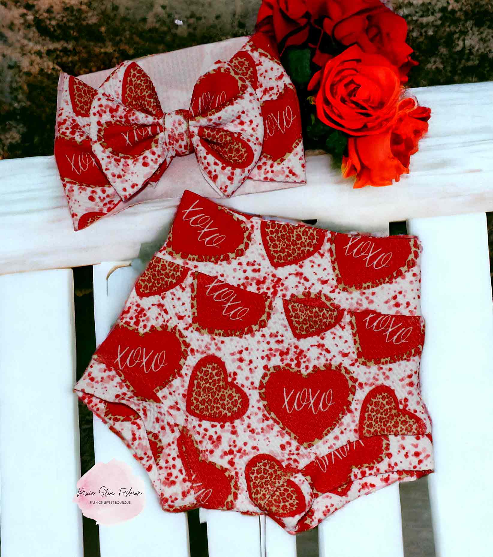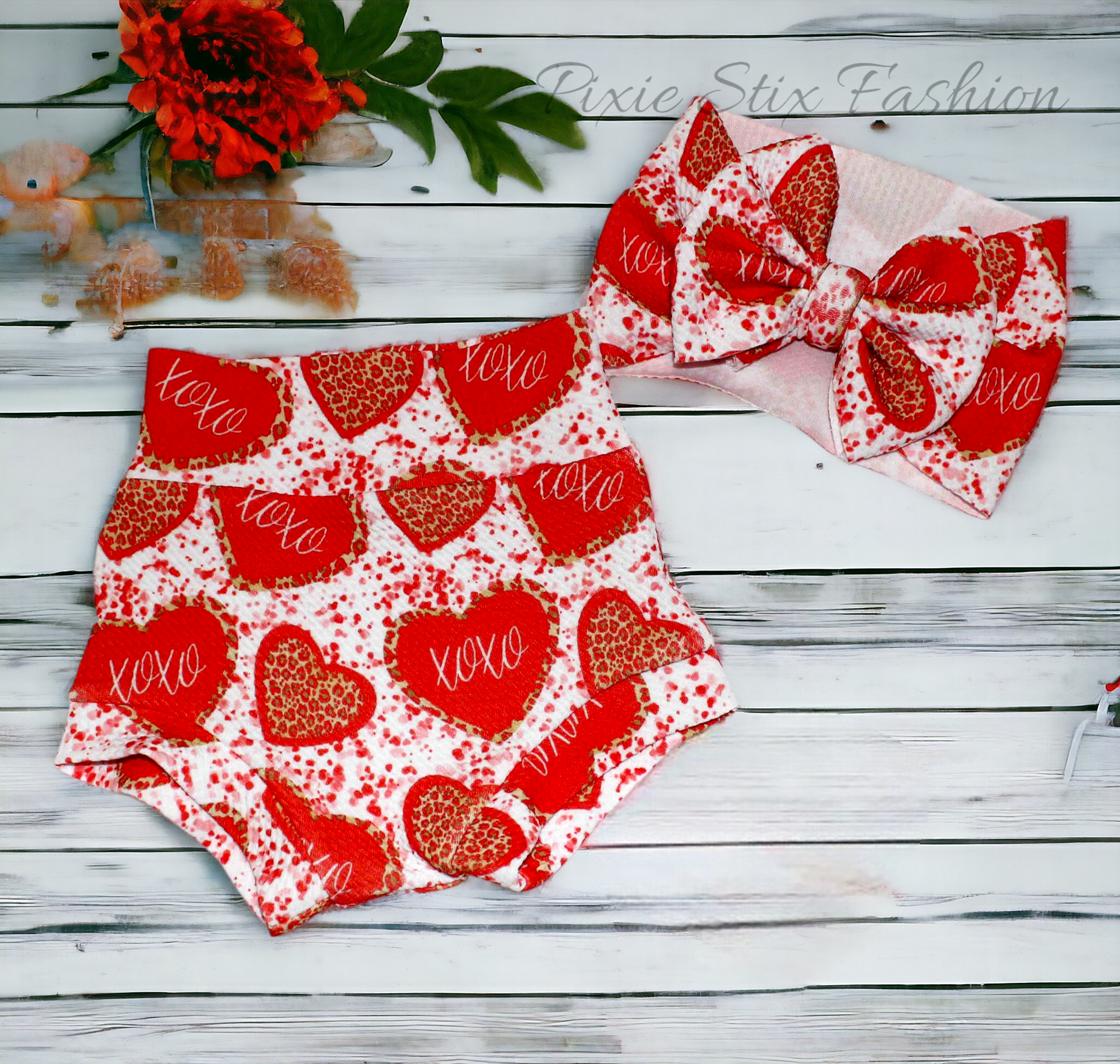 XOXOXO Leopard Hearts Valentine Bummie and Bow Set/Valentines Day Baby Girl Outfit, High Waisted Bummy/Valentine's Day Baby Girl